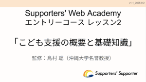 2025年6月19日 / 最終更新日時 : 2025年7月21日 Supporters’ Supporter エントリーコース E001_こども支援者としての倫理 このレッスンでは、こども支援に携わるスタッフに必要な基本的な倫理や、こどもとの関わりの基礎についての学びを提供します。 確認テスト 参考資料_リフレクション実践例_v1.0 コメントを残す コメントをキャンセルメールアドレスが公開されることはありません。 ※ が付いている欄は必須項目ですコメント ※ 名前 ※ メール ※ サイト 次回のコメントで使用するためブラウザーに自分の名前、メールアドレス、サイトを保存する。