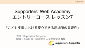 2025年6月19日 / 最終更新日時 : 2025年6月19日 Supporters’ Supporter エントリーコース E008_こども支援におけるバウンダリーの重要性 このレッスンでは、こども支援におけるバウンダリーの概要とその重要性を理解し、実際にバウンダリーを意識した関わりを持つための学びを提供します。 コメントを残す コメントをキャンセルメールアドレスが公開されることはありません。 ※ が付いている欄は必須項目ですコメント ※ 名前 ※ メール ※ サイト 次回のコメントで使用するためブラウザーに自分の名前、メールアドレス、サイトを保存する。