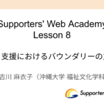 2026年1月23日 / 最終更新日時 : 2026年1月24日 Supporters’ Supporter エントリーコース E008_こども支援におけるバウンダリーの重要性 このレッスンでは、こども支援におけるバウンダリーの概要とその重要性を理解し、実際にバウンダリーを意識した関わりを持つための学びを提供します。